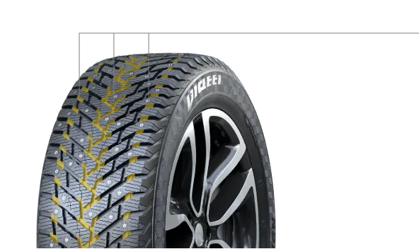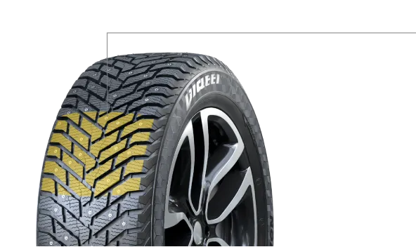 Элементы рисунка вокруг шипов противоскольжения создают эффект щетки, очищая поверхность льда или укатанного снега для повышения эффективности работы шипов в режиме разгона и торможения